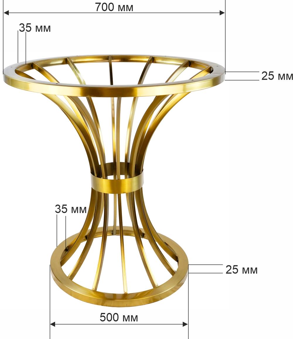 Устойчивая конструкция с диаметром верхней части 70 см и нижней 50 см обеспечивает надежную поддержку столешницам Ø80 см. Полированная поверхность устойчива к коррозии и механическим повреждениям, сохраняя безупречный внешний вид при интенсивной эксплуатации.